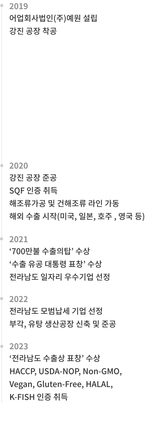 "우리의 바다를 품은 해조류 전문기업" 어업회사법인 (주)예원은 전라남도 강진군에 있으며,