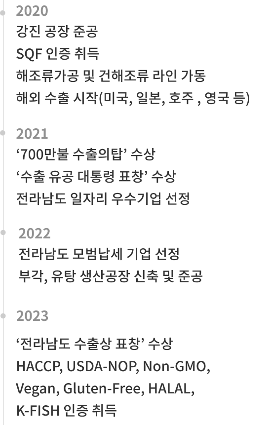 대한민국 해조류 산업의 활성화와 해조류 제품에 대한 전문성을 갖추기 위하여 2020년 별도의 법인을 설립하게 되었습니다.